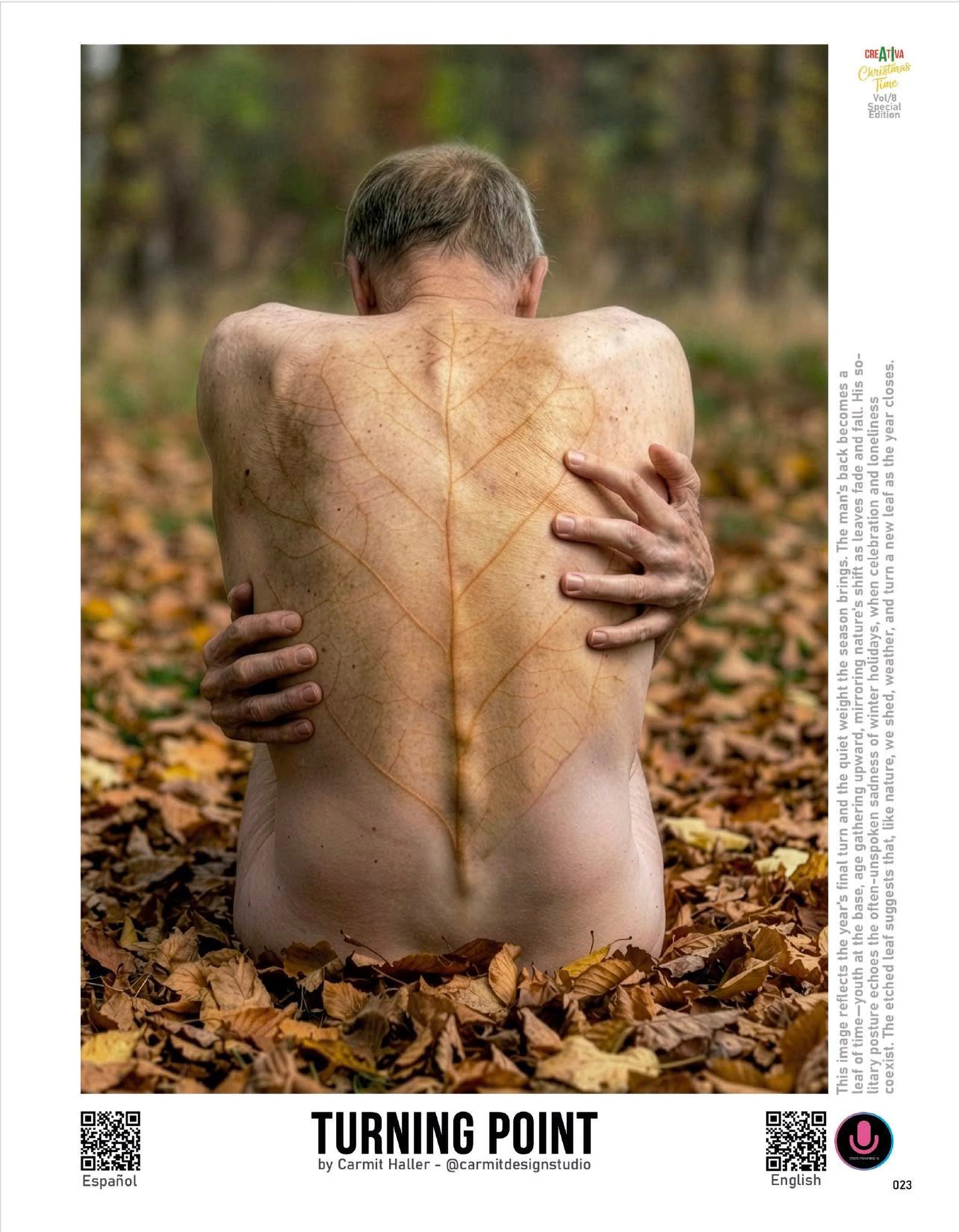 “Turning Point” reflects the year's final turn and the quiet weight the season brings. The man's back becomes a leaf of time: youth at the base, age gathering upward, mirroring nature's shift as leaves fade and fall. His solitary posture echoes the often unspoken sadness of winter holidays, when celebration and loneliness coexist. The etched leaf suggests that, like nature, we shed, weather, and turn a new leaf as the year closes.